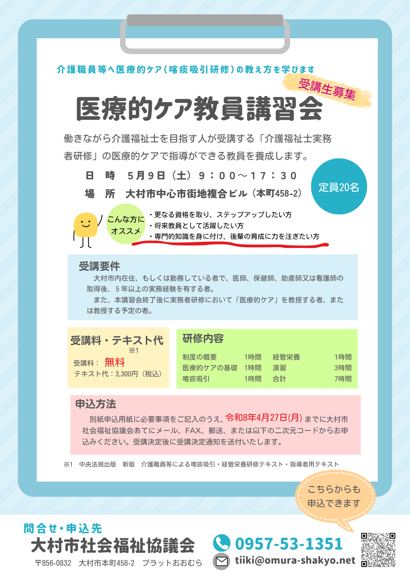 また、本講習会修了後に実務者研修において「医療的ケア」を教授