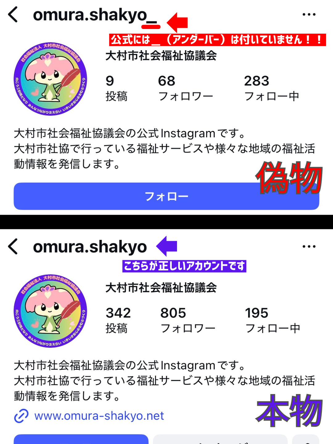 なお、偽アカウントにつきましては、Instagram(インスタグラム)を運営しているMeta社へなりすましアカウントであることの報告を行っております。